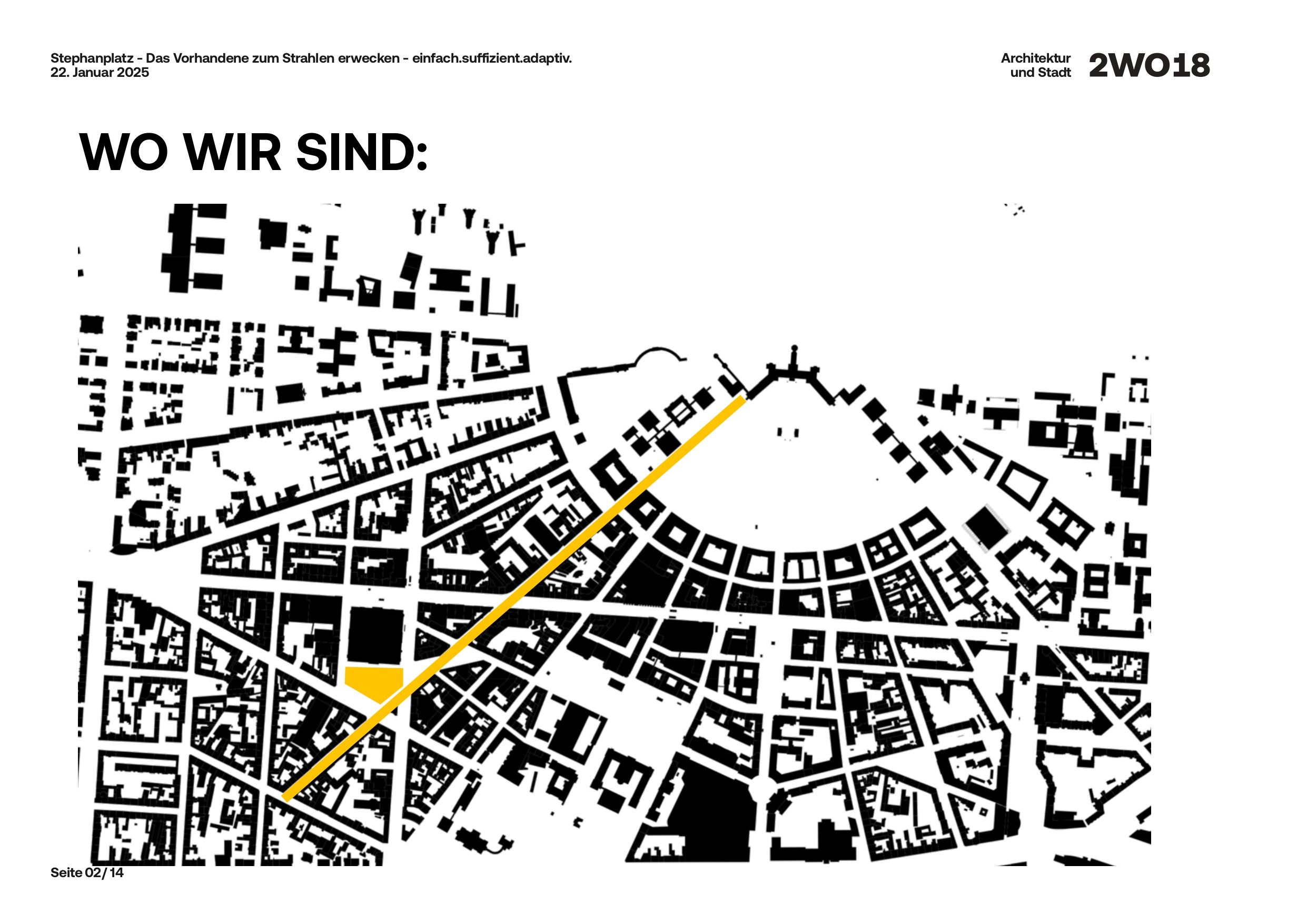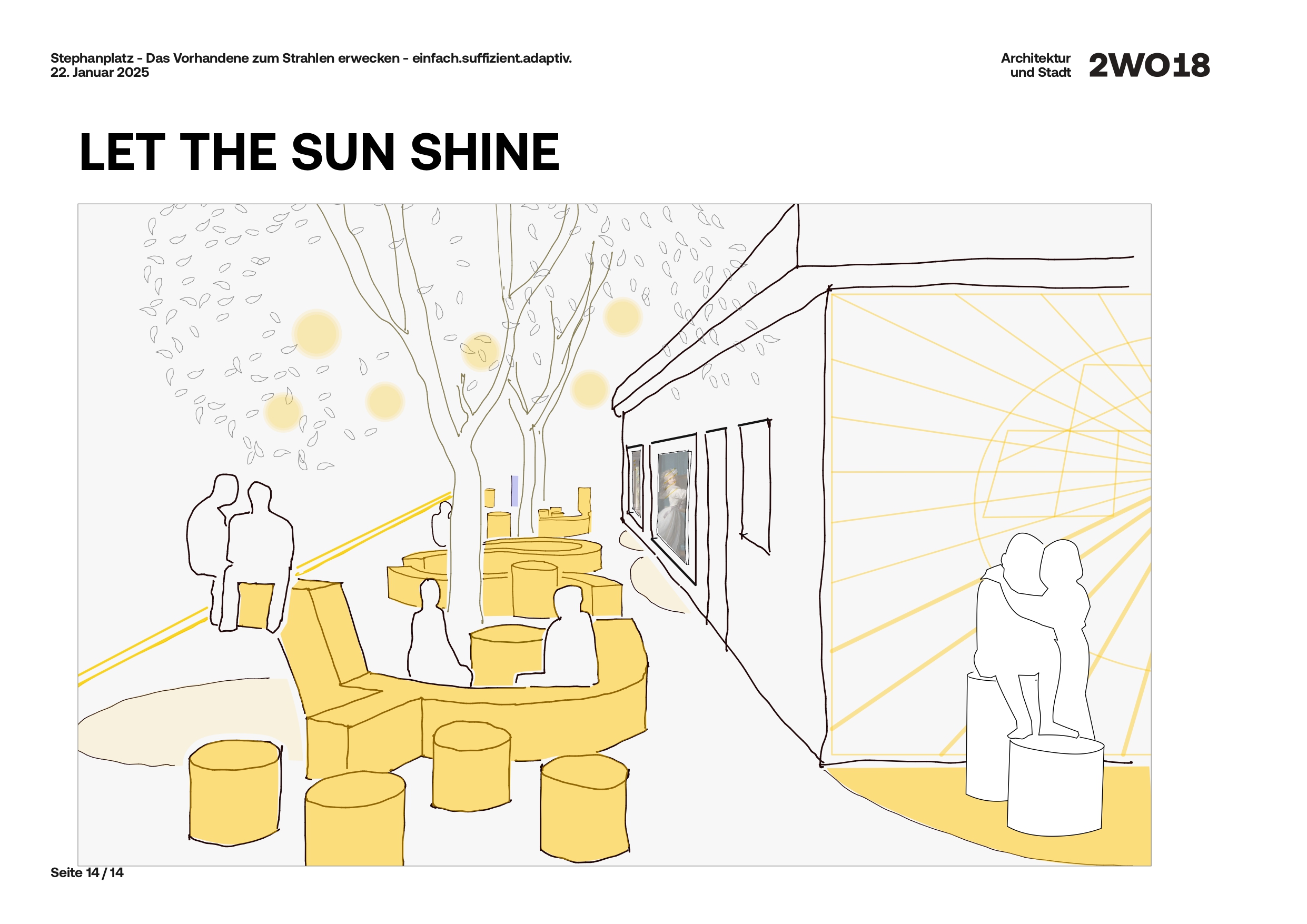 „LET THE SUN SHINE” ist ein urbaner Ort der Begegnung und des Austauschs an der Waldstraße, einem Strahl im Karlsruher Sonnenfächer. Die Intervention bietet mit einem langen geschwundenen „Sitz-Sonnenstrahl“ am Stephanplatz die Möglichkeit zu verweilen, zu kommunizieren, zu spielen, zu essen und den Stehanplatz als Erholungsraum zu genießen.