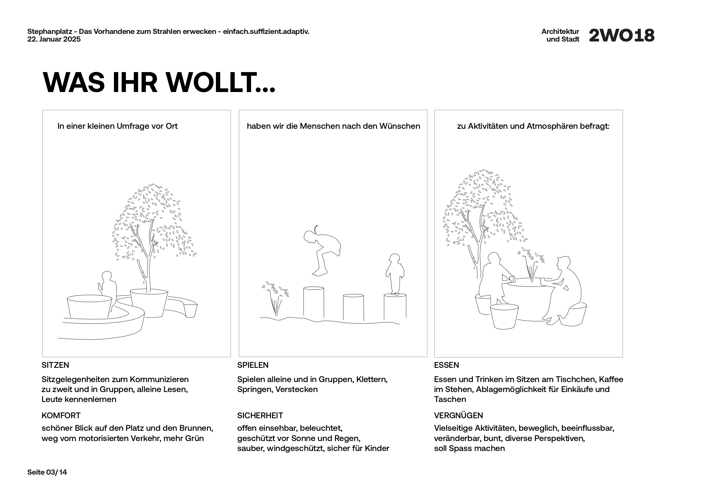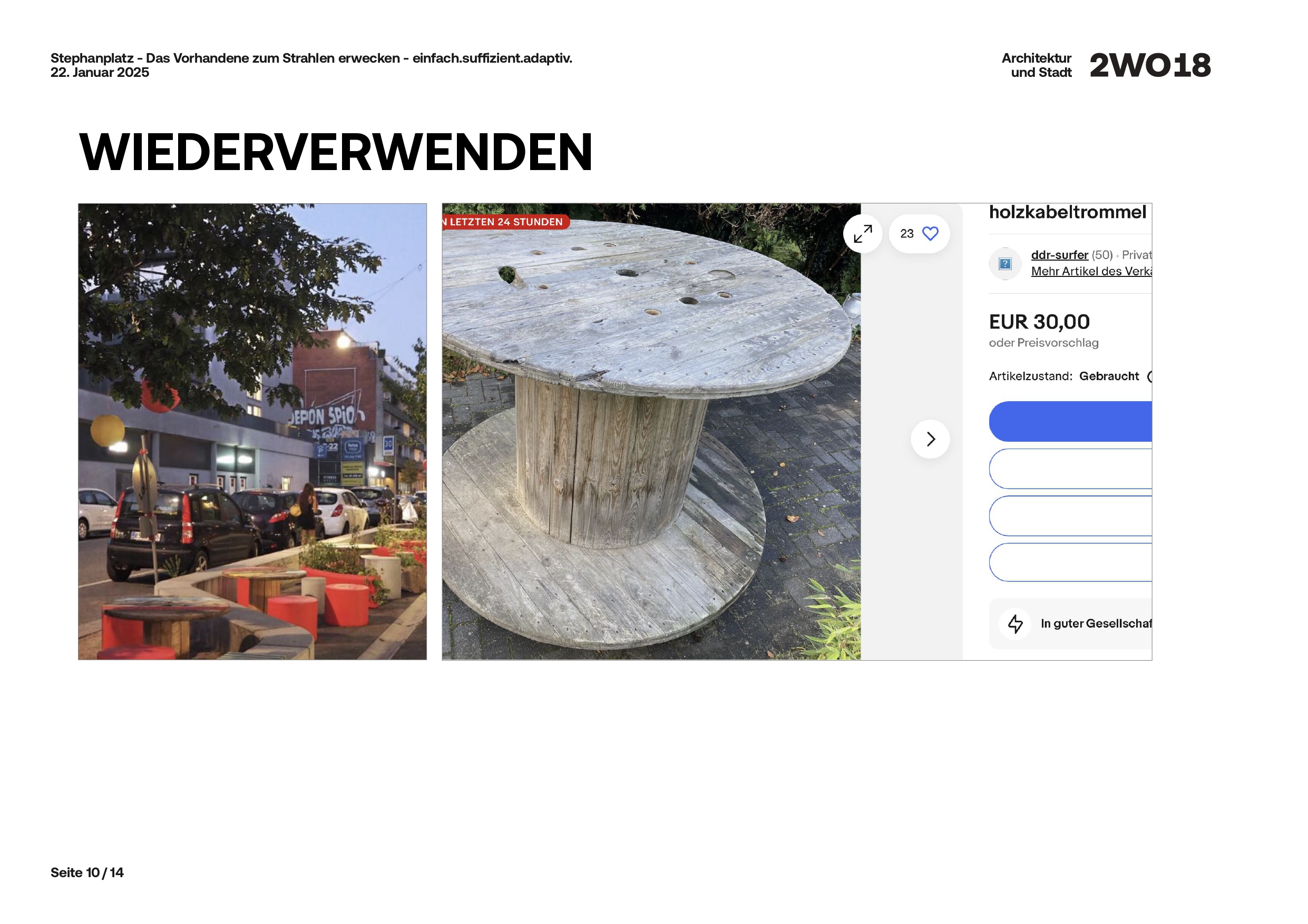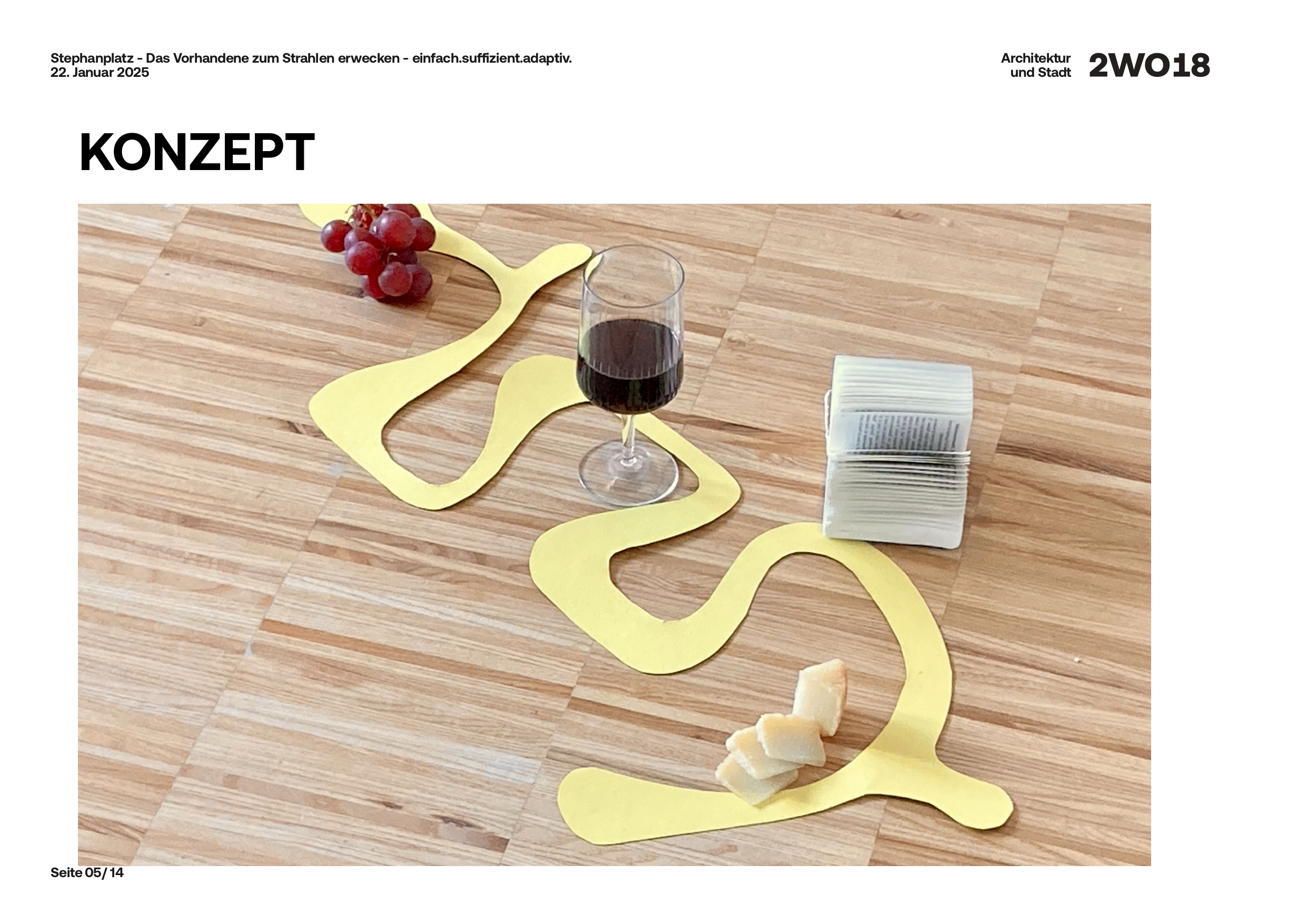 Das lange Sitz-Element ist das Kernstück der Installation. Mit Hockern, Bänken, Bögen und in die Luft ragenden Sitzwinkeln bietet es diverse Möglichkeiten alleine, zu zweit oder in Gruppen am Stephanplatz zu verweilen, zu klettern, zu essen oder einfach die Sonne zu genießen. Kleine Tischchen aus gebrauchten Materialien, wie beispielsweise hölzerne Kabeltrommeln ergänzen das Ensemble.