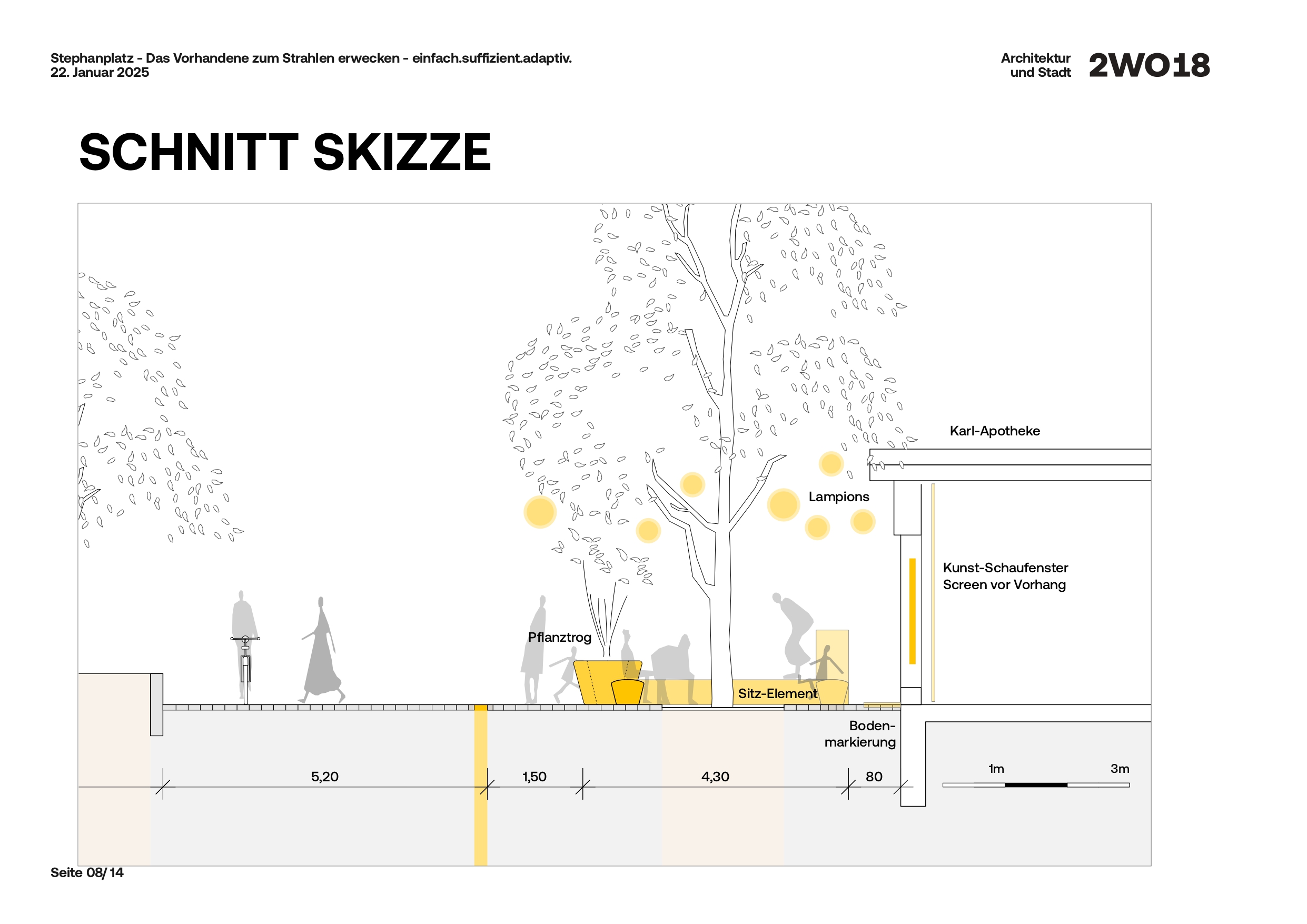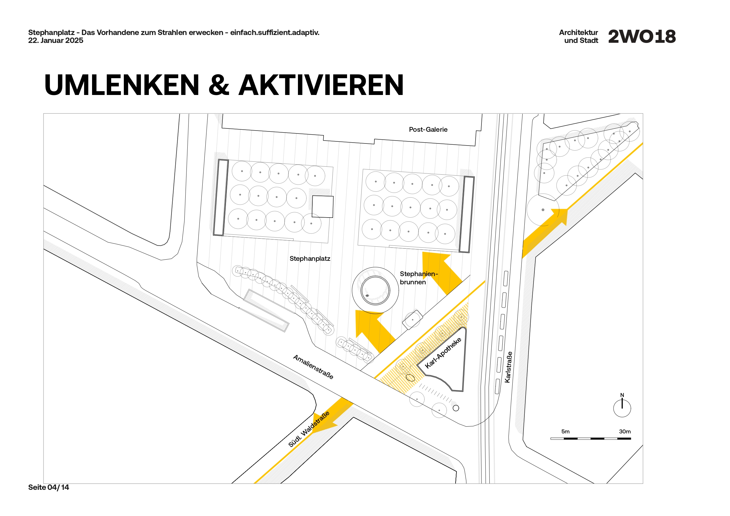 Die vorgefundenen Ressourcen, wie die bestehenden Bäume, Absperrungen und Markierungen im Plattenbelag werden sensibel in die Gestaltung integriert. Mit der Intervention wird der dynamische Wegeraum der Waldstraße unterbrochen und umgelenkt.