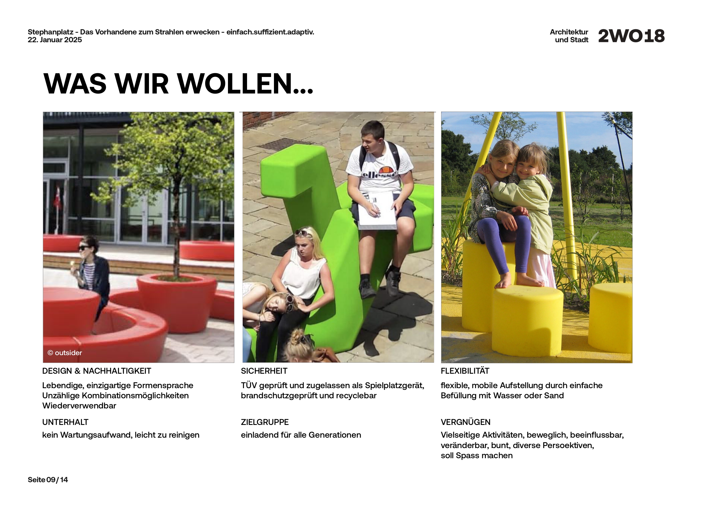 Aufgrund des engen Zeitrahmens und der gewünschten Fertigstellung im April dieses Jahres schlagen wir Elemente der Firma Outsider vor. Sie bestechen durch Langlebigkeit, Witterungsbeständigkeit, Vandalismussicherheit, Flexibilität, Transportabilität, sind umfallsicher und TÜV geprüft.